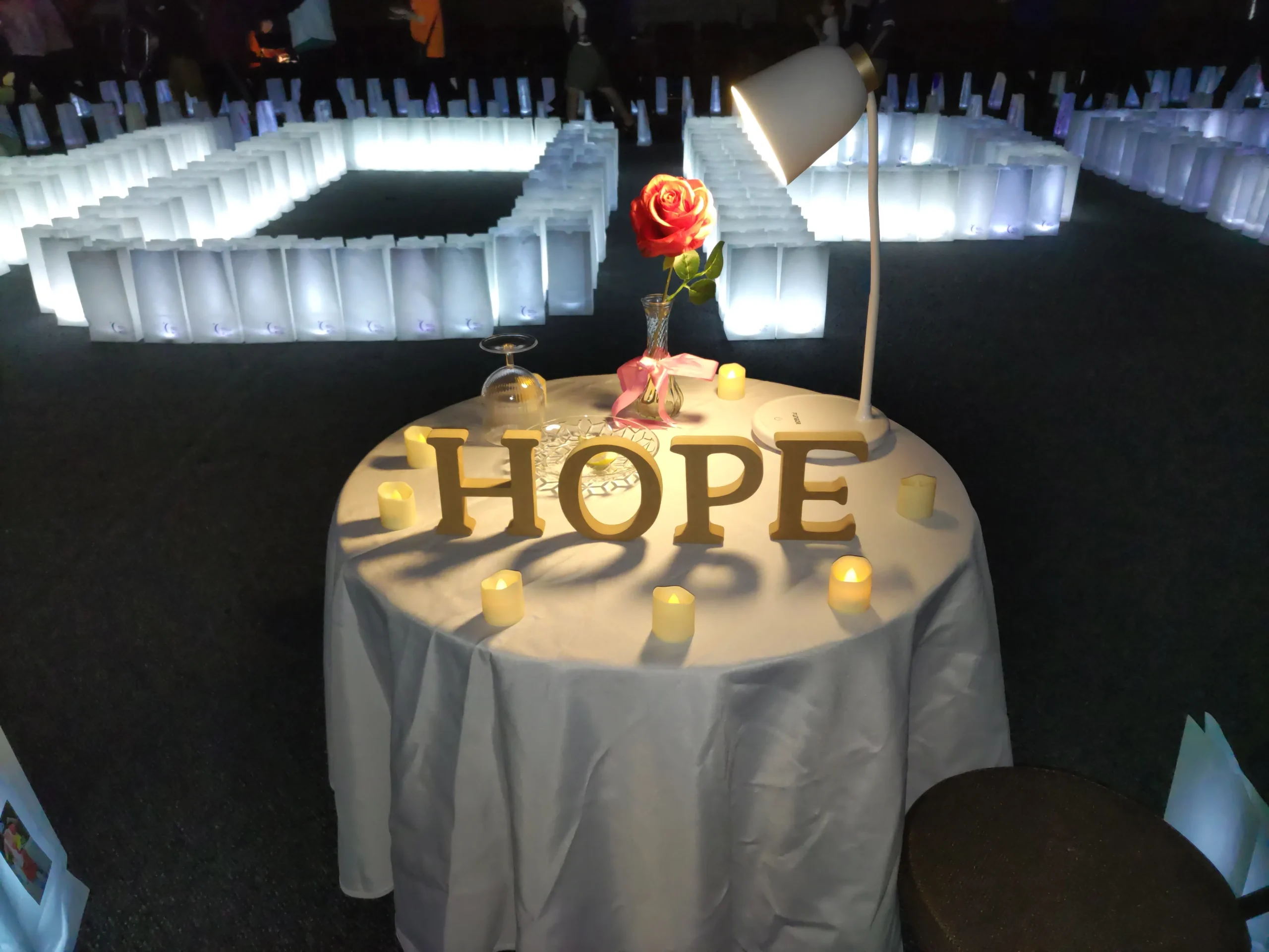 あなたがルミナリエに書いたメッセージがキャンドルの光で浮かび上がります。がんで亡くなった方々をしのび、がんと闘っている人たちを励まします。